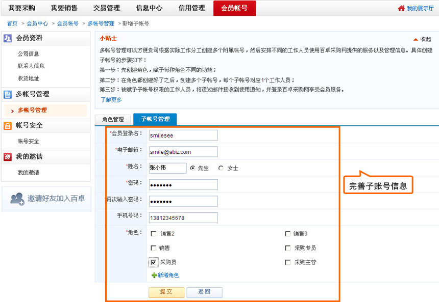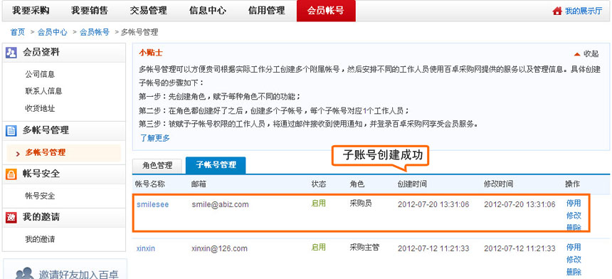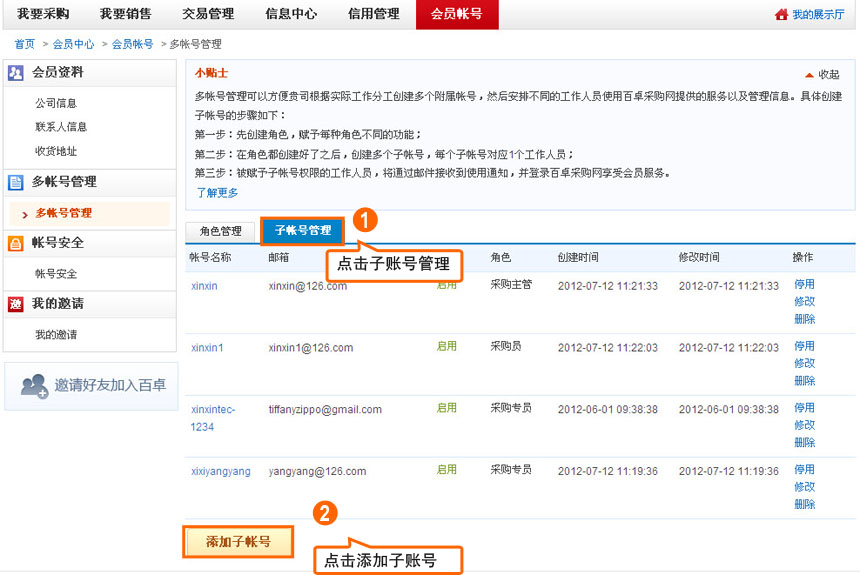 子帐号的创建可以帮您把采购业务分配到不同帐号中,便于您的业务有序开展,并对各子帐号进行有效管理。